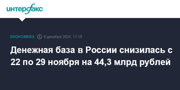На 22 ноября денежная база в России равнялась 18 273 млрд рублей. Таким образом, за период она снизилась на 0,25%, или на 44,3 млрд рублей.