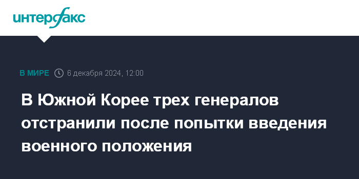 Москва. 6 декабря. INTERFAX.RU - Минобороны Южной Кореи объявило, что отстраняет трех представителейвоенного руководства от исполнения обязанностей из-за их содействия президенту страны Юн Сок Ёлю в недавней попытке ввести военное положение, передает "Ренхап".