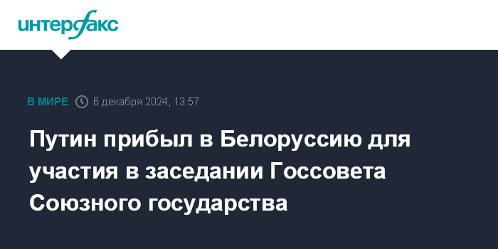 Москва. 6 декабря. INTERFAX.RU - Президент РФ Владимир Путин прибыл в столицу Белоруссии, где примет участие в заседании Высшего Государственного совета Союзного государства.