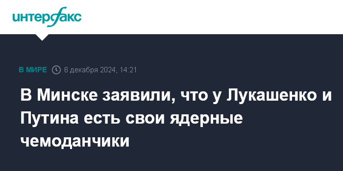 Москва. 6 декабря. INTERFAX.RU - У президентов Белоруссии и России Александра Лукашенко и Владимира Путина есть свои "красные кнопки" и свои ядерные чемоданчики, заявил Госсекретарь Совета безопасности республики Александр Вольфович в пятницу в Минске.