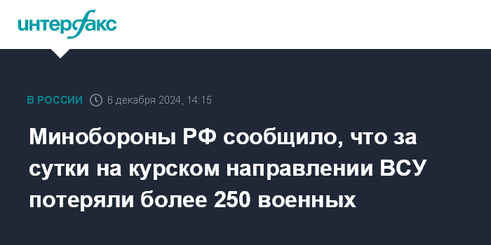 Минобороны РФ сообщило, что за сутки на курском направлении ВСУ потеряли более 250 военных