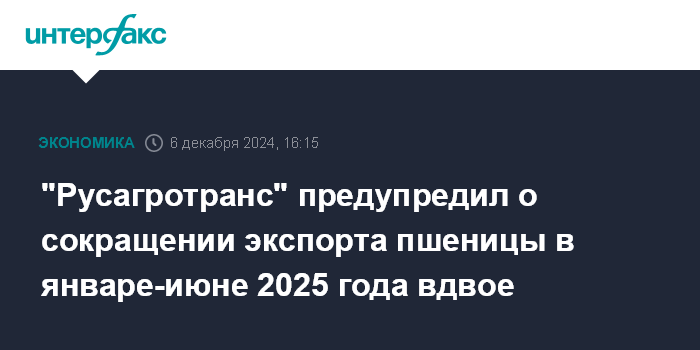 "Русагротранс" предупредил о сокращении экспорта пшеницы в январе-июне 2025 года вдвое