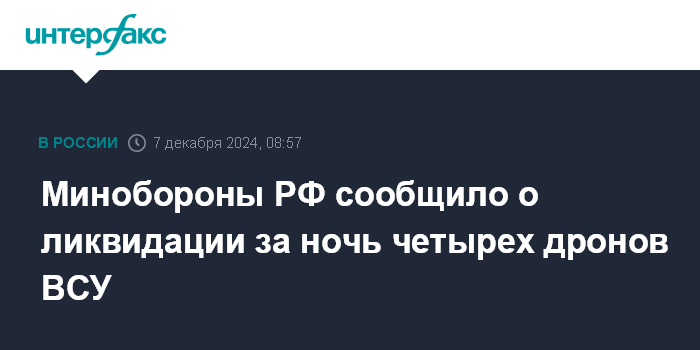 Минобороны РФ сообщило о ликвидации за ночь четырех дронов ВСУ