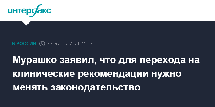 Москва. 7 декабря. INTERFAX.RU - Переход на систему клинических рекомендаций в практике здравоохранения РФ будет сопровождаться изменениями в законодательстве, сообщил министр здравоохранения РФ Михаил Мурашко в субботу.