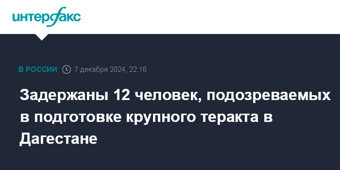 "В результате оперативно-розыскных мероприятий, проведенных сотрудниками УФСБ по Республике Дагестан, во взаимодействии с МВД по РД задержаны двенадцать членов законспирированной ячейки запрещенной в России террористической организации, планировавших осуществить крупный террористический акт", - сказал собеседник агентства.