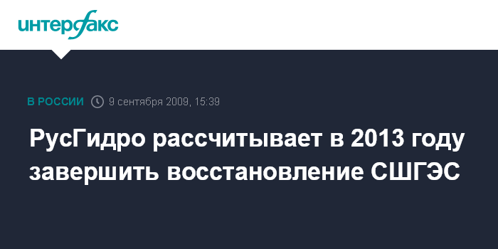 Москва. 9 сентября. INTERFAX.RU - Совет директоров ОАО "РусГидро" в среду рассмотрел стратегические задачи по восстановлению Саяно-Шушенской ГЭС. Как сообщил "Интерфаксу" один из участников заседания, перед компанией поставлена задача по вводу в эксплуатацию в 2010 году двух гидроагрегатов станции - 5-го и 6-го. Окончательно работы по восстановлению станции должны быть завершены к 2013 году.