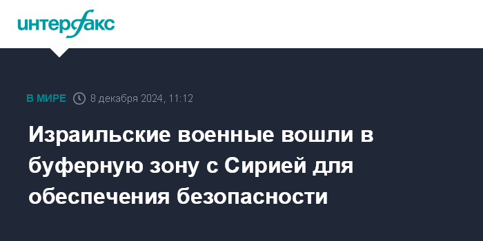 Москва. 8 декабря. INTERFAX.RU - Армия обороны Израиля заявила, что ее бойцы занимают позиции в буферной зоне на Голанских высотах на фоне сообщений о свержении президента Башара Асада в Сирии, сообщает в воскресенье The Times of Israel.