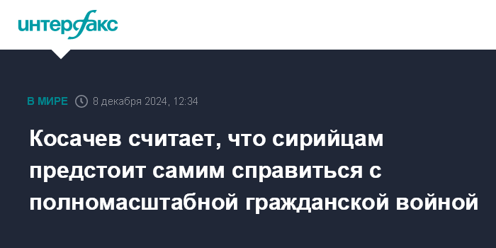 Москва. 8 декабря. INTERFAX.RU - Сирийцам придется самим справляться с полномасштабной гражданской войной, Россия вряд ли может оказать поддержку в таких условиях, считает вице-спикер Совета Федерации Константин Косачев.