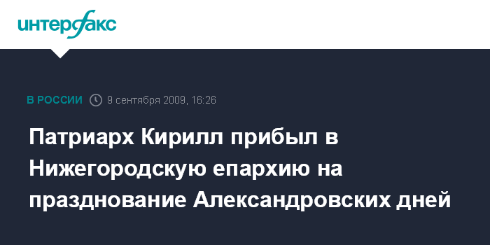 Москва. 9 сентября. INTERFAX.RU - Патриарх Московский и всея Руси Кирилл в среду прибыл с пастырским визитом в Нижегородскую епархию на торжества, посвященные памяти святого князя Александра Невского. Патриарх Кирилл начал свой визит с посещения города Сарова, передает корреспондент "Интерфакс-Религия" (www.interfax-religion.ru). В местном аэропорту предстоятеля встретили архиепископ Нижегородский и Арзамасский Георгий, полпред президента РФ в Приволжском федеральном округе Григорий Рапота, глава администрации Сарова Александр Орлов, епархиальное духовенство, саровские кадеты и учащиеся городской православной гимназии.