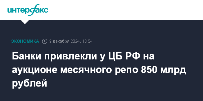 Москва. 9 декабря. INTERFAX.RU - Банки привлекли на аукционе месячного репо ЦБ РФ 850 млрд рублей при лимите 1 трлн рублей, сообщается на сайте регулятора.