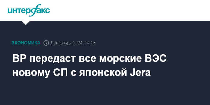Москва. 9 декабря. INTERFAX.RU - Британская BP plc передаст все свои активы в области морской ветроэнергетики новому совместному предприятию с крупнейшей генерирующей компанией Японии Jera, пишет Financial Times со ссылкой на пресс-релиз ВР.