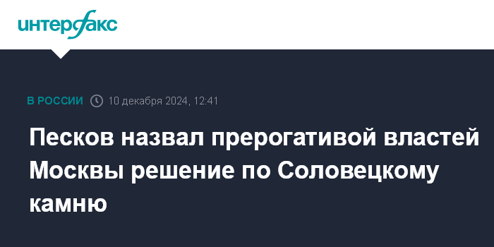 Москва. 10 декабря. INTERFAX.RU - Принятие решения о переносе Соловецкого камня с Лубянки является прерогативой столичных властей, Кремль не хотел бы вмешиваться в компетенции города, заявил пресс-секретарь президента РФ Дмитрий Песков.