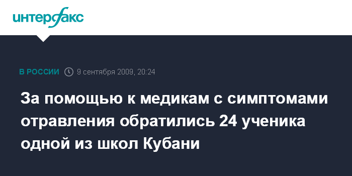 Москва. 9 сентября. INTERFAX.RU - В Динском районе Краснодарского края за медицинской помощью единовременно обратились 24 ребенка с симптомами пищевого отравления, сообщили агентству "Интерфакс-Юге" в следственном управлении Следственного комитета при прокуратуре РФ по Краснодарскому краю. "Все обратившиеся за помощью дети обучаются в школе № 29 станицы Новотиторовская. Первоначальный диагноз - пищевое отравление - у детей не подтвердился", - отметил представитель СУ СКП по Краснодарскому краю. В настоящее время все дети находятся дома на амбулаторном лечении.