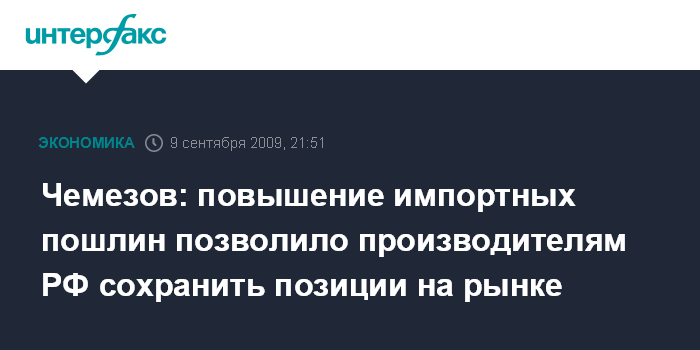 Москва. 9 сентября. INTERFAX.RU - Повышение пошлин на импорт автомобилей позволило российским производителями сохранить свои позиции на рынке, заявил гендиректор "Ростехнологий" Сергей Чемезов. "Если бы этого не было сделано, то, я думаю, мы сегодня бы уже рынок потеряли", - сказал он в интервью телеканалу "Вести".