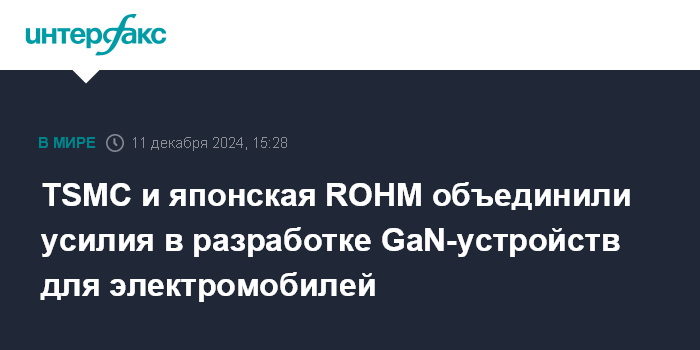 Москва. 11 декабря. INTERFAX.RU - Taiwan Semiconductor Manufacturing Company (TSMC) и японский производитель полупроводниковых и электронных компонентов ROHM создали партнерство с целью совместной разработки и массового выпуска силовых устройств на основе нитрида галлия (GaN) для применения в электромобилях.