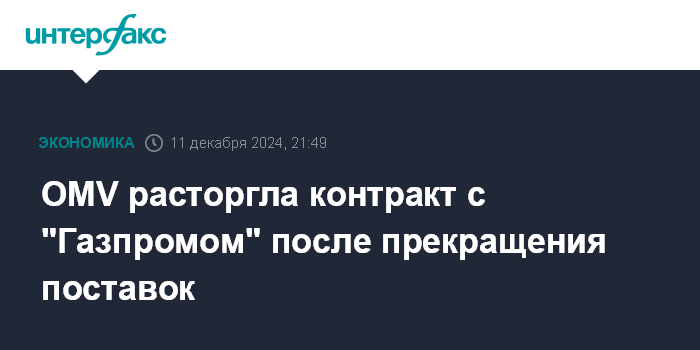 Москва. 11 декабря. INTERFAX.RU - Компания OMV Gas Marketing & Trading GmbH приняла решение о немедленном расторжении своего контракта на поставку газа в Австрию с дочерней компанией "Газпрома" ООО "Газпром экспорт", сообщила OMV.