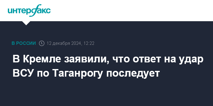 Москва. 12 декабря. INTERFAX.RU - Ответ России на удар Украины по Таганрогу обязательно последует - тогда и так, как будет признано целесообразным, заявил пресс-секретарь президента РФ Дмитрий Песков.