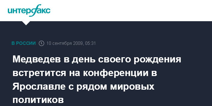 Москва. 10 сентября. ИНТЕРФАКС - Президент РФ Дмитрий Медведев 14 сентября, в день своего рождения, посетит Ярославль, где примет участие в международной конференции "Современное государство и глобальная безопасность".