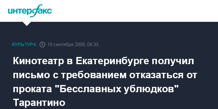 Москва. 10 сентября. INTERFAX.RU - Руководству кинотеатра "Салют" в Екатеринбурге поступило письмо с угрозой взорвать кинотеатр, если они не прекратят прокат фильма Квентина Тарантино "Бесславные ублюдки".