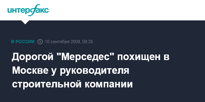 Москва. 10 сентября. INTERFAX.RU – В Москве у руководителя строительной компании похищен "Мерседес", ущерб составил 9 млн рублей, сообщил "Интерфаксу" в четверг источник в правоохранительных органах.