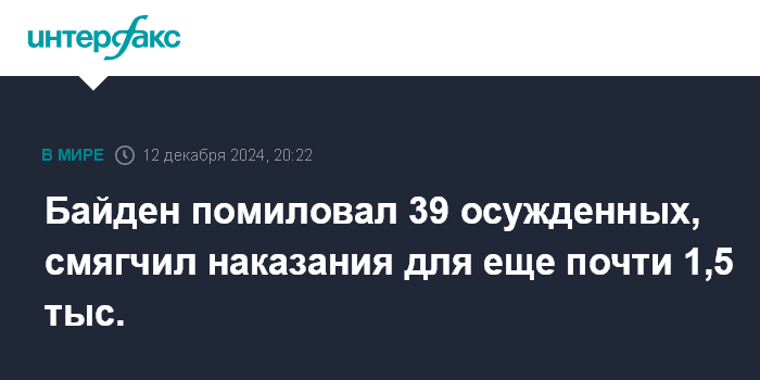 Москва. 12 декабря. INTERFAX.RU - Президент США Джо Байден помиловал 39 заключенных, осужденных за ненасильственные преступления, и смягчил наказания для еще почти 1,5 тыс. человек, сообщается в четверг на сайте Белого дома.