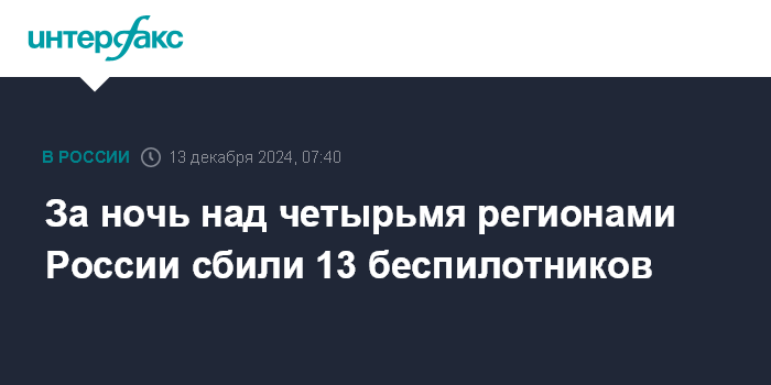 За ночь над четырьмя регионами России сбили 13 беспилотников