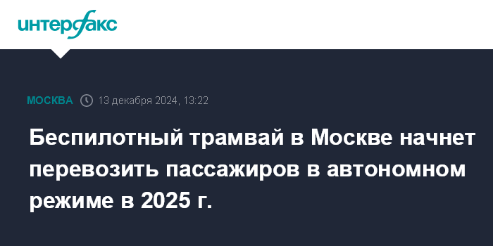 Москва. 13 декабря. INTERFAX.RU - К концу следующего года в столице беспилотный трамвай начнет работать в полностью автономном режиме с пассажирами на маршруте, сообщил мэр Москвы Сергей Собянин.