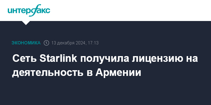 Москва. 13 декабря. INTERFAX.RU - Комиссия по регулированию общественных услуг (КРОУ) Армении выдала лицензию на деятельность в республике сети Starlink, заявил министр высокотехнологической промышленности Армении Мхитар Айрапетян.