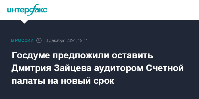 Москва. 13 декабря. INTERFAX.RU - Президент Владимир Путин внес в Госдуму кандидатуру Дмитрия Зайцева на пост аудитора Счетной палаты, сообщили в пресс-службе палаты.