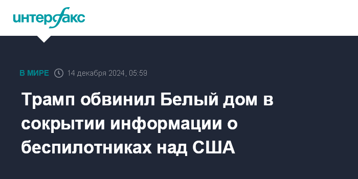 Москва. 14 декабря. INTERFAX.RU - Избранный президент США Дональд Трамп заявил, что американская администрация, возможно, скрывает от общественности информацию о появившихся в небе над рядом штатов неопознанных беспилотниках, и призвал сбивать их.