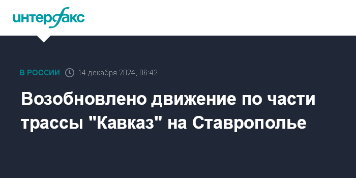 Москва. 14 декабря. INTERFAX.RU - Участок федеральной автодороги "Кавказ" на территории Ставропольского края, закрытый в пятницу вечером для движения автомобилей из-за непогоды, открыт, сообщило в субботу управление Госавтоинспекция по региону.
