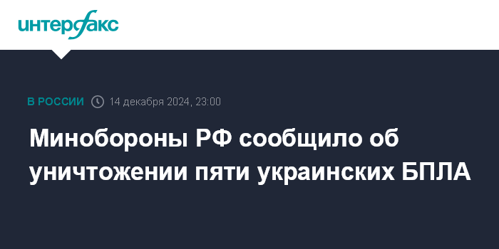 Москва. 14 декабря. INTERFAX.RU - Силы противовоздушной обороны сбили пять украинских беспилотников над территорией РФ, сообщили в российском оборонном ведомстве.