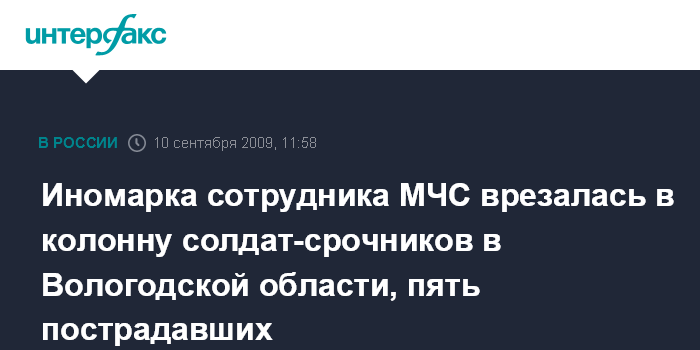 Москва. 10 сентября. INTERFAX.RU - Сотрудник МЧС совершил наезд на взвод солдат в Вологодской области близ войсковой части около поселка Рыбинский на дороге Вологда-Сокол.