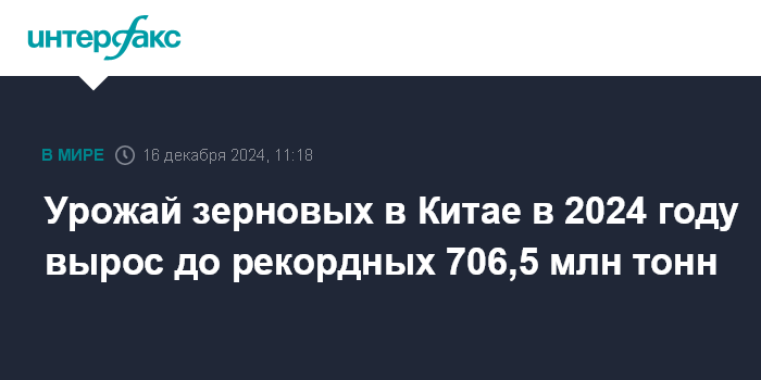 Москва. 16 декабря. INTERFAX.RU - Урожай зерновых в Китае в 2024 году достиг рекордных 706,5 млн тонн, что на 1,6% превысило прошлогодний результат, сообщило Государственное статистическое управление (ГСУ).