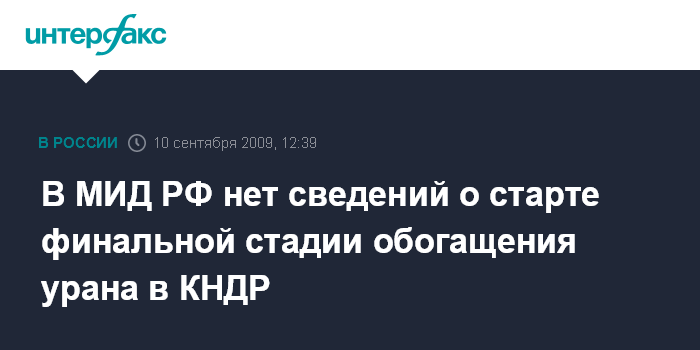 Москва. 10 сентября. INTERFAX.RU - МИД РФ не имеет информации о том, что КНДР приступила к финальной стадии процесса обогащения урана.