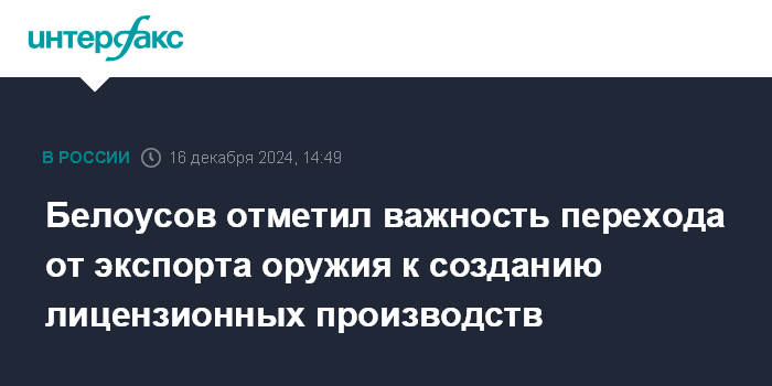 Москва. 16 декабря. INTERFAX.RU - Министр обороны Андрей Белоусов заявил на коллегии министерства о необходимости перехода от экспорта российского оружия к созданию лицензионных производств.