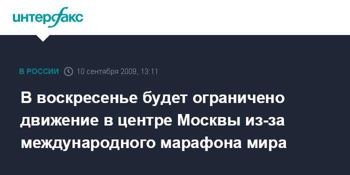 Москва. 10 сентября. INTERFAX.RU - В связи с проведением 13 сентября 2009 года Московского международного марафона мира на центральных улицах города будет ограничено движение автотранспорта, сообщили "Интерфаксу" в столичной ГИБДД в четверг.