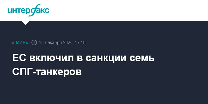 Москва. 16 декабря. INTERFAX.RU - Евросоюз включил в санкционный список семь танкеров для перевозки сжиженного природного газа (СПГ), один из них работает на проекте "Ямал СПГ" - танкер Christophe de Margerie.