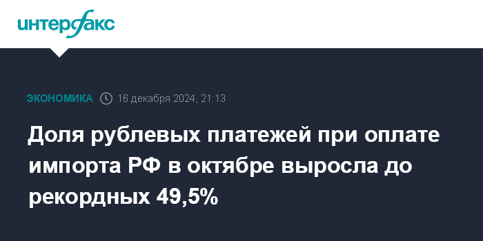 Москва. 16 декабря. INTERFAX.RU - Доля платежей в российских рублях при оплате импортных поставок в РФ товаров и оказания услуг в октябре 2024 года достигла нового максимума - 49,5%, превысив прежний рекордный уровень, зафиксированный в сентябре - 48,4%, следует из данных ЦБ РФ о валютной структуре внешнеторговых расчетов.