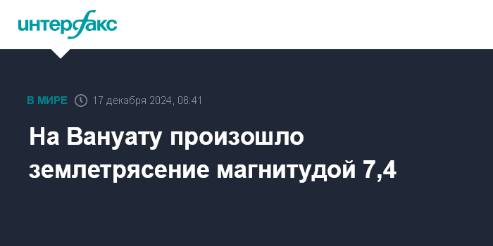 Москва. 17 декабря. INTERFAX.RU - Подземный толчок магнитудой 7,4 зафиксирован в акватории Кораллового моря у берегов островного государства Вануату, сообщает Алтае-Саянский филиал Единой геофизической службы РАН.