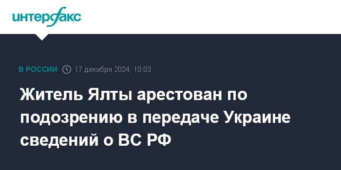 Москва. 17 декабря. INTERFAX.RU - ФСБ сообщила о задержании и аресте жителя Ялты, подозреваемого в сотрудничестве с украинской военной разведкой.