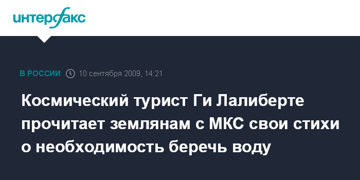 Москва. 10 сентября. INTERFAX.RU - Седьмой космический турист, владелец "Цирка Дю Солей" Ги Лалиберте во время полета на Международную космическую станцию прочитает свои стихи о воде. "Я зачитаю свое поэтическое сочинение с орбиты, которое также будут читать различные артисты в 14 городах по всему миру", - сказал космический турист на пресс-конференции в четверг. По его словам, стихотворение будет посвящено необходимости беречь воду. В полет миллионер намерен взять девять клоунских носов для каждого из членов экипажа станции.