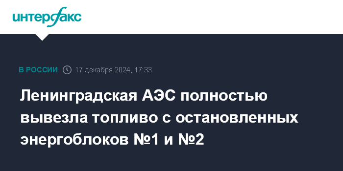 Москва. 17 декабря. INTERFAX.RU - Ленинградская АЭС (ЛАЭС, филиал АО "Концерн Росэнергоатом") полностью удалила ядерное топливо с остановленных ранее для вывода из эксплуатации энергоблоков №1 и №2, сообщило управление коммуникаций станции.