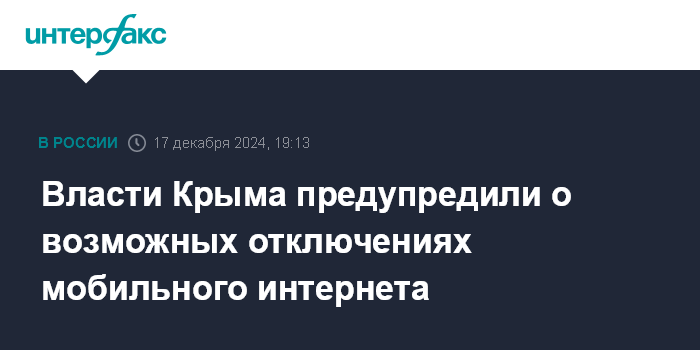 Москва. 17 декабря. INTERFAX.RU - Отключения мобильного интернета возможны в Крыму со вторника "для обеспечения безопасности жителей", сообщается в телеграм-канале Мининформа республики.