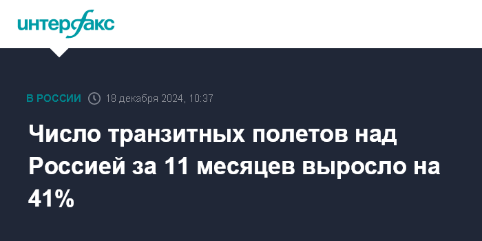 Москва. 18 декабря. INTERFAX.RU - Число транзитных полетов через воздушное пространство России, выполненных иностранными авиакомпаниями, за 11 месяцев 2024 года выросло на 41% в годовом исчислении, сообщил на пресс-конференции гендиректор ФГУП "Госкорпорация по организации воздушного движения" (ГК по ОрВД, оператор аэронавигационного обслуживания) Андрей Булин.
