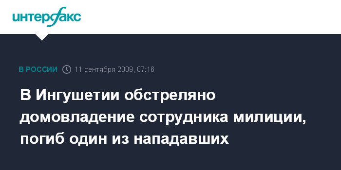 Назрань. 11 сентября. ИНТЕРФАКС-ЮГ - Неизвестные обстреляли из стрелкового оружия частное домовладение милиционера в Назрани, один из нападавших преступников погиб на месте.