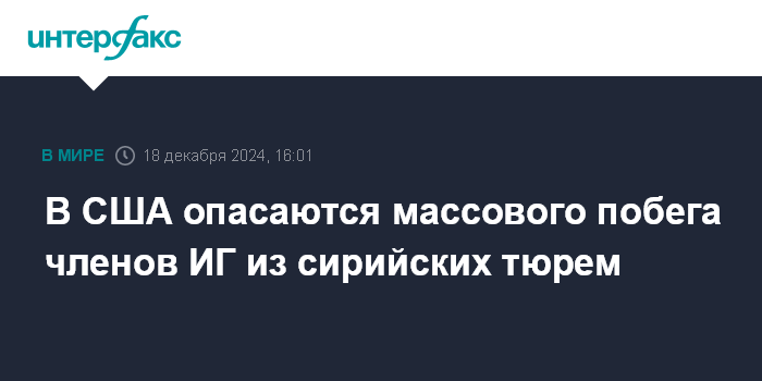 Москва. 18 декабря. INTERFAX.RU - В США чиновники обеспокоены тем, что, после отхода от власти президента Сирии Башара Асада тысячи боевиков ИГ (признано в России террористической организацией и запрещено), содержащихся в сирийских тюрьмах, могут оказаться на свободе, пишет Politico.