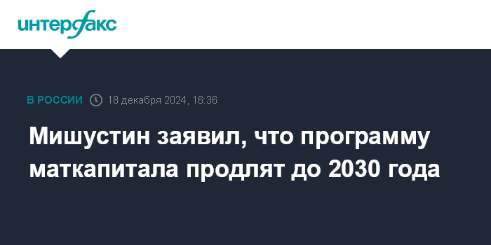"По инициативе президента программа материнского капитала будет продлена до 2030 года включительно. И для этого мы сегодня рассмотрим необходимые поправки в действующее законодательство. (...) Пролонгация действующей программы до 2030 года позволит поддержать еще почти 5 млн семей" , - сказал Мишустин на заседании правительства в среду.