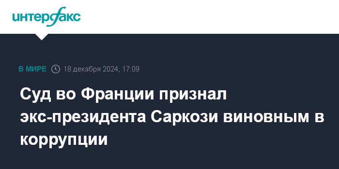 Москва. 18 декабря. INTERFAX.RU - Французский суд высшей инстанции признал экс-президента Франции Николя Саркози виновным по делу о коррупции и злоупотреблении влиянием, сообщает в среду телеканал BFM TV.
