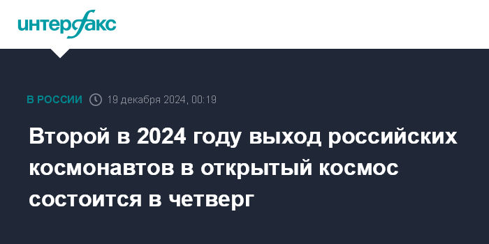 Второй в 2024 году выход российских космонавтов в открытый космос состоится в четверг